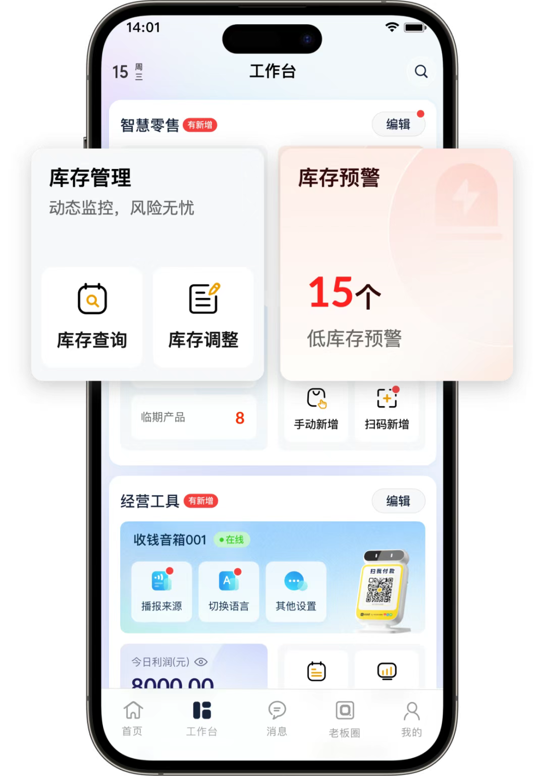 - 专业收银设备:扫码王、收钱音箱、收银机,提升店内收款效率。