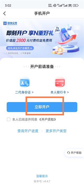 2、点击立即开户【开户前需要准备二代身份证、本人银行卡】
