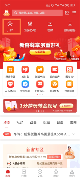 1、进入国海金探号APP先需要开户,点击开户