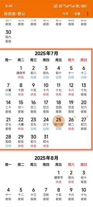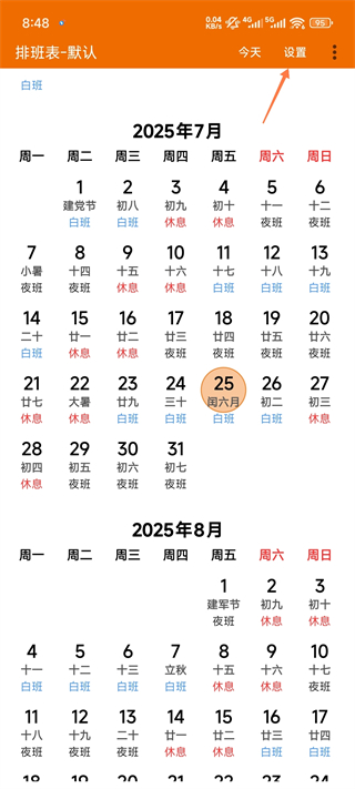 1、下载并安装我的排班表App最新版,当前页面是默认排班表,点击右上角的设置