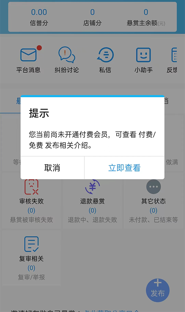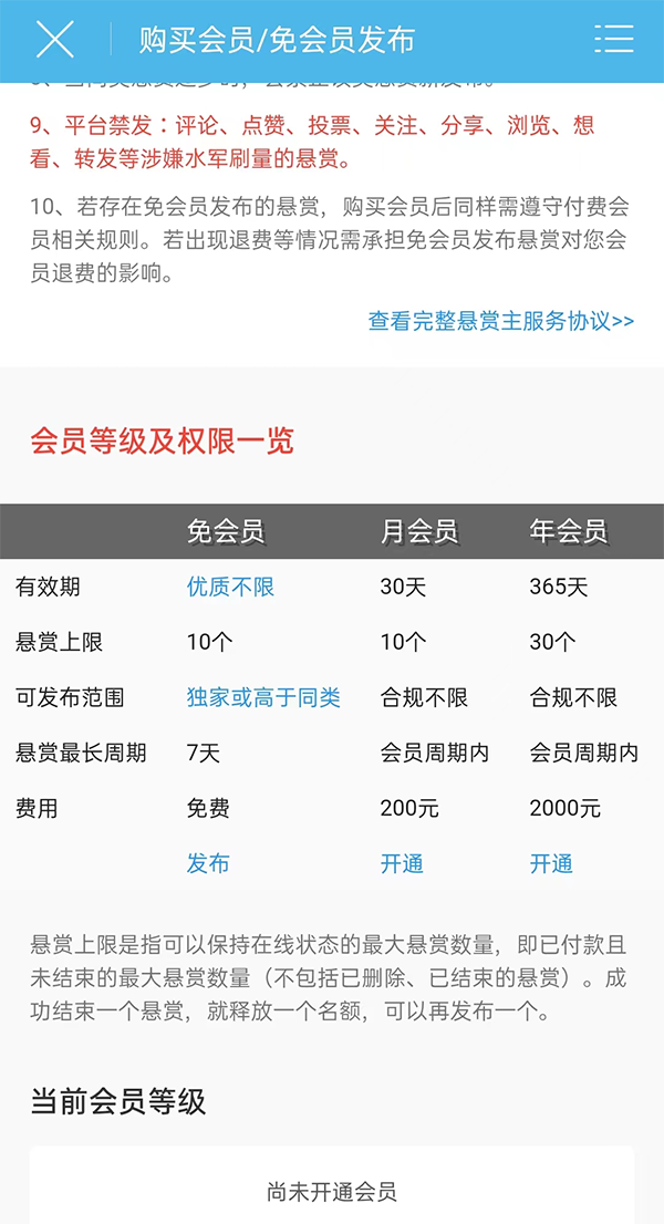 4、发布任务悬赏需要用户开通会员