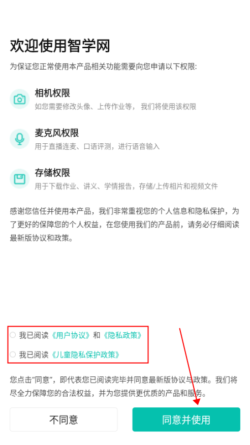 1、首先,进入手机上的智学网APP,然后,点击下方的【同意并使用】。