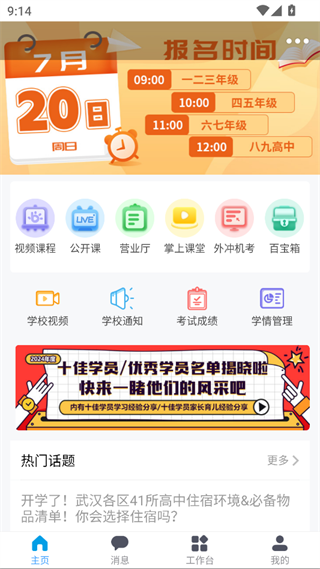 呈现报名时间、考试成绩、课程与通知入口、及热门话题,是获取多元信息的集中展示区