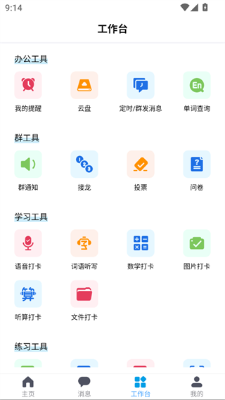 汇聚办公、群、学习、练习等工具,覆盖提醒、打卡、问卷等功能,助力教学管理