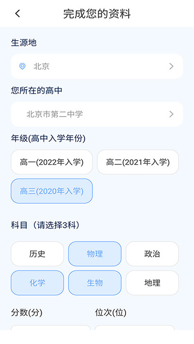 1、首先我们需要完善自己的各项【基本信息】,包括生源地、所在高中、入学年份、科目和平时成绩等;