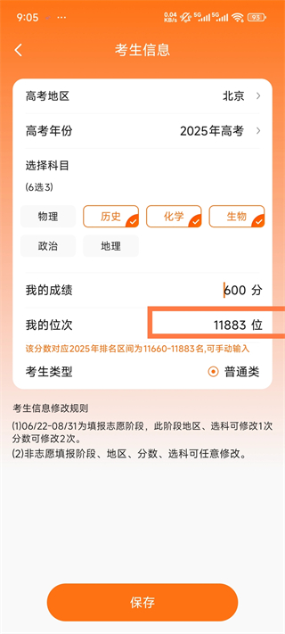 2、选择科目输入成绩后会立马出现排名,点击保存