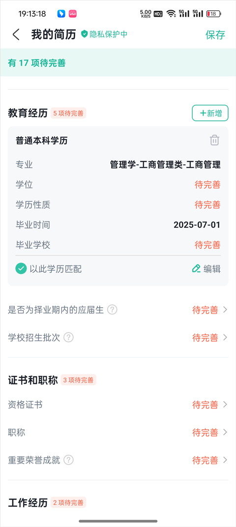 5、最后回到编辑教育经历页面,可以看到专业已经选择成功了,点击下方的“保存”按钮即可修改成功。