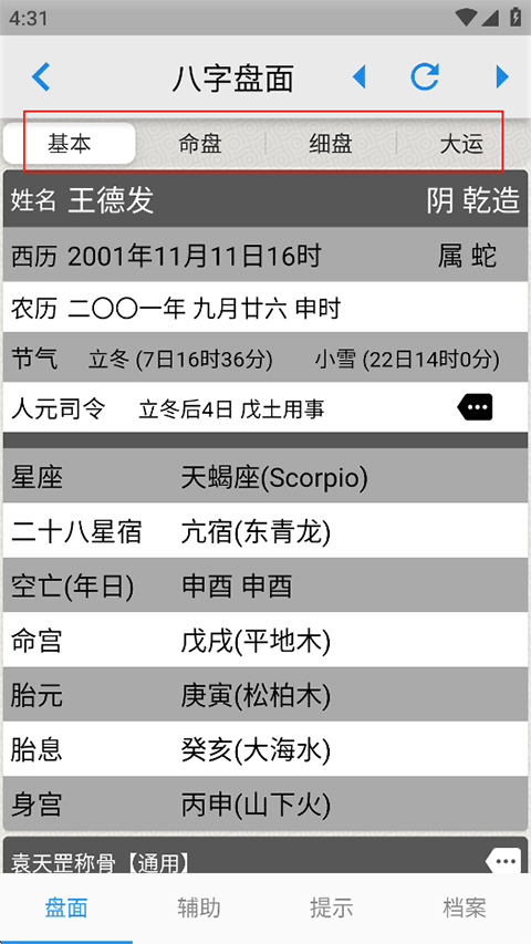 5、上方提供了命盘、细盘、大运等运势类型,下方还有盘面、辅助、提示和档案功能。