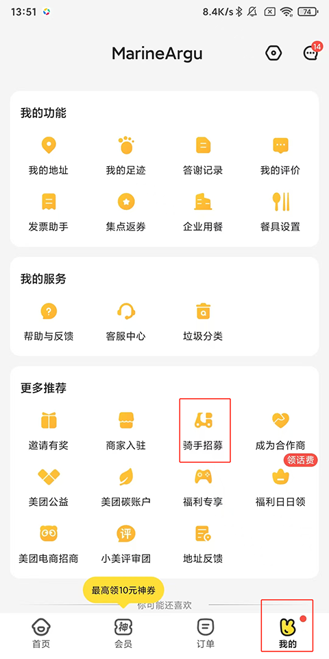 1、打开美团外卖APP后,点击右下角的“我的”选项,找到“骑手招募”入口:在“我的”页面中,向上滑动屏幕,找到并点击“骑手招募”选项。