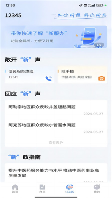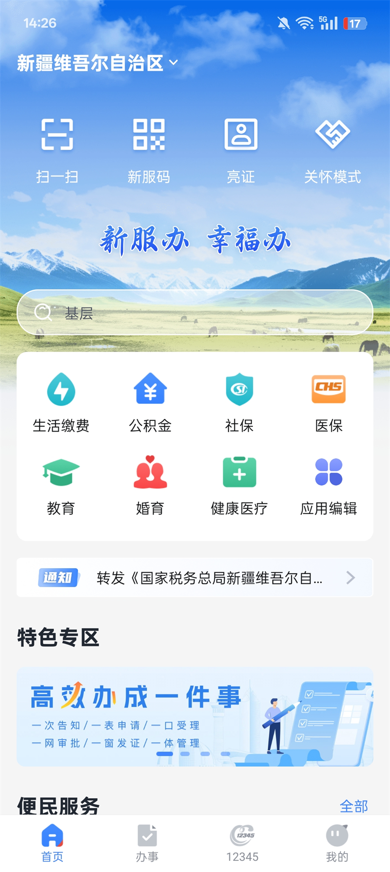 新服办App是基于新疆政务服务一体化平台全区掌上办事官方唯一入口软件,囊括"掌上办事"、"掌上咨询"、"健康码服务"以及查询社保、查询公积金、查询医保等便民服务功能。个人或企业用户都能在此找到已实现在线办理的所有政务服务事项,体验个性化掌上办事服务的便利!新服办软件内还提供了社区周边美食、酒店、电影、购物等海量商户信息,有需要的用户欢迎下载体验!