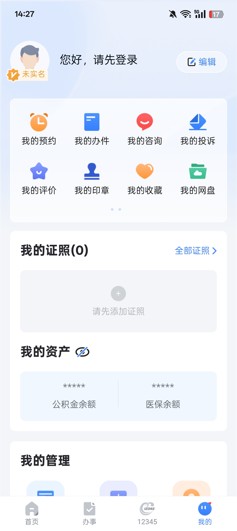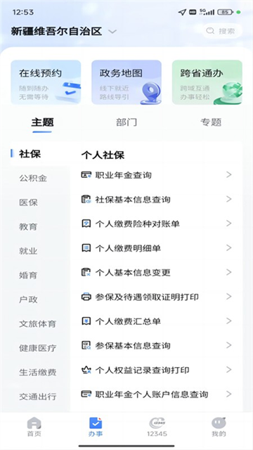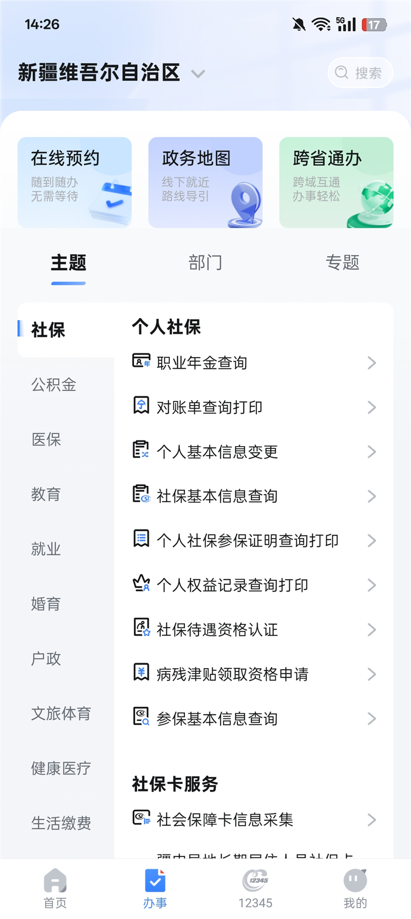在首页,用户可以快速点击常见热门办事功能模块,包括社保、医保、公积金等。