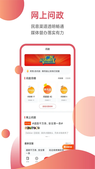 2、区别于传统新闻平台,触电新闻打造“广东民声热线”“问政广场”等栏目,打通政府与市民之间的信息屏障。群众可以随时留言反映问题,平台将实时督办、反馈,有效实现“让你说,有人听;你提了,有人办”。