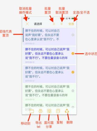 2、长按首页的任意一条便签,进入批量操作模式,如下图