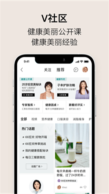 营养师,健康、美丽专家,资深用户荟聚,分享新资讯、健康美丽知识和经验;特邀国际营养师、三甲医院专家、专业美容师,提供健康美丽公开课;