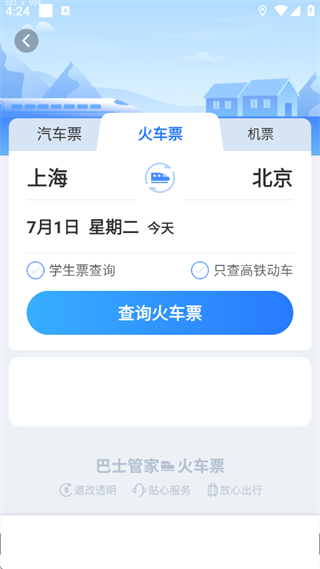 v9.4.0巴士管家是一款聚焦于交通出行服务的APP。软件支持办理汽车票、城际定制快车、公务用车等版块,在这里用户能轻松办理各种用车订车业务,不论你是想要购买机票、火车票、汽车票,还是说想要退票、补票、改签,它都能为你办理解决;不仅如此,巴士管家订票网App还能对你的行程进行实时的追踪,让你在线就可查询火车票晚点信息。让用户无论是出门在外,还是在家等,都可以通过巴士管家来帮助你,让你出行无忧,愉快出行!是你出行旅游的必备神器。