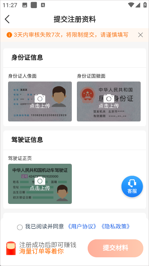3、资料拍好以后,点击提交。等待系统审核,收到通过短信,就可以出车接单了。