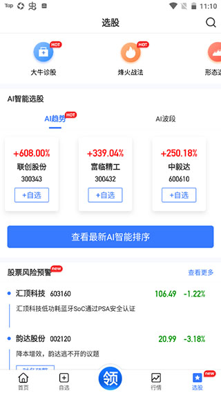 v2.0.1汇炒股软件是专门为广大股民用户专门打造的选股、诊股类软件,主要面对一些初入股市的小散用户,提供股票市场行情资讯以及参考指标,依托大数据技术为用户来挑选优质股票,从而让用户得到可得的股票红利。与此同时,该软件还十分注重对用户需求的专业化、精细化、个性化服务,力求给每一用户量身打造出一套股票理财方案。有需要的欢迎来下载!