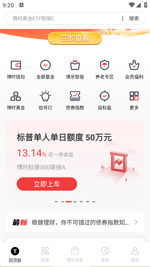 1、打开博时基金APP,在首页提供了钱包、基金、债券等众多功能模块;