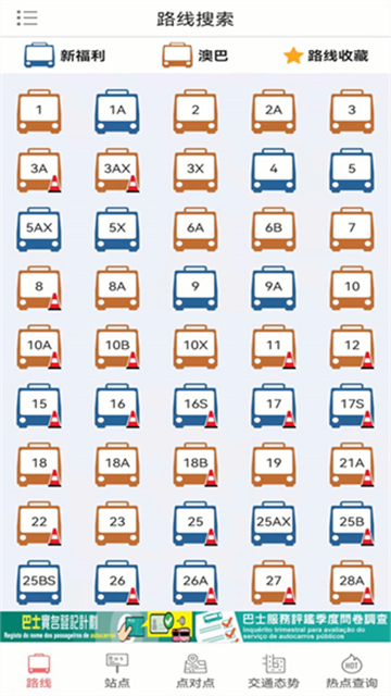 在澳门出行必不可少的交通工具就是巴士了,而为了大家能够在第一时间内就了解巴士的出行及到站时间,这里特意给大家带来了这款巴士报站app。该应用是是澳门交通事务局推出的巴士信息发布平台,提供澳门巴士路线查询、站点查询、实时巴士信息、巴士候车和乘车等信息服务,其功能与“车来了”差不多,不过它仅限于在澳门使用。软件内为用户精心准备了当地所有巴士的出行信息,并且使用也简单,用户只需要根据自己的需求在搜索栏内搜索巴士路线即可,然后系统就会自动为用户展示该巴士的所有站点信息,包括出行时间和到站时间,非常的方便。有需要的用户赶紧来下载吧!