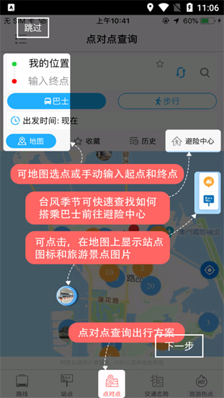 【换乘查询】:不知道公交站名,只需输入地点名或当前位置或地图选点即可;