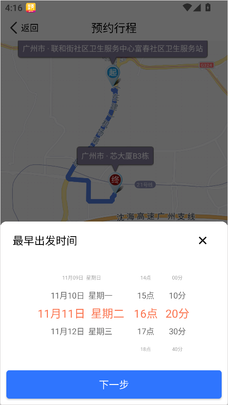 2、接着选择合适的出发时间,系统会根据时间智能推荐司机;