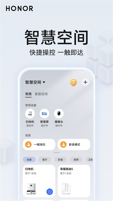 荣耀智慧空间App支持管理和控制多种智能设备,包括灯光、空调、电视、音箱等;用户可以通过一个集中的平台进行设备的统一管理和控制,方便快捷;