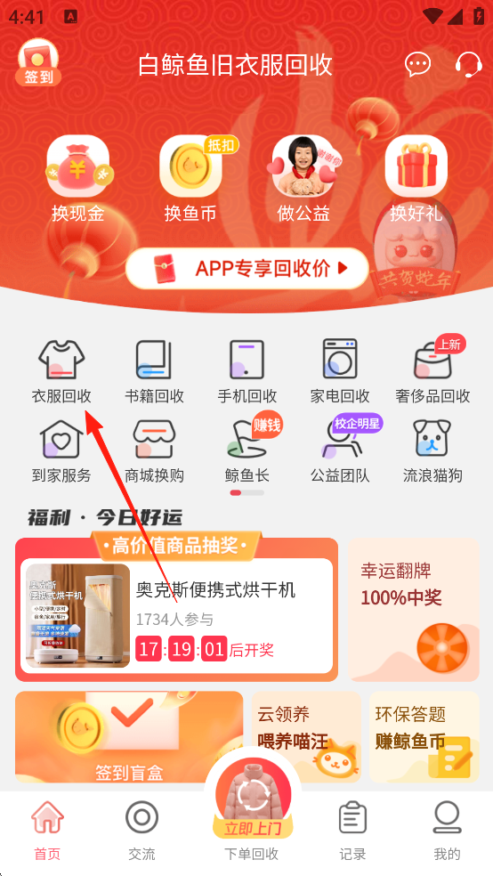 1、进入软件,直接点击旧衣回收服务