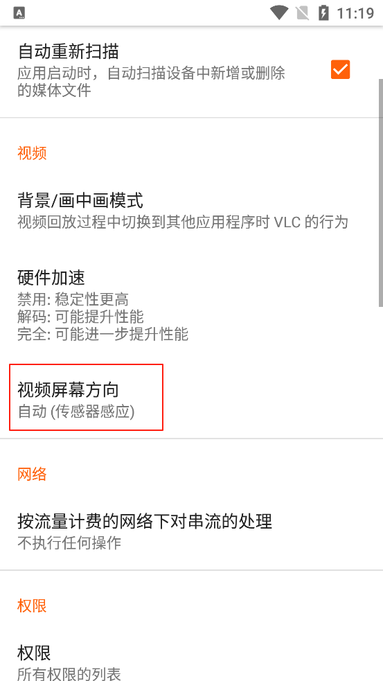 2、进入设置界面,找到视频屏幕方向并点击。