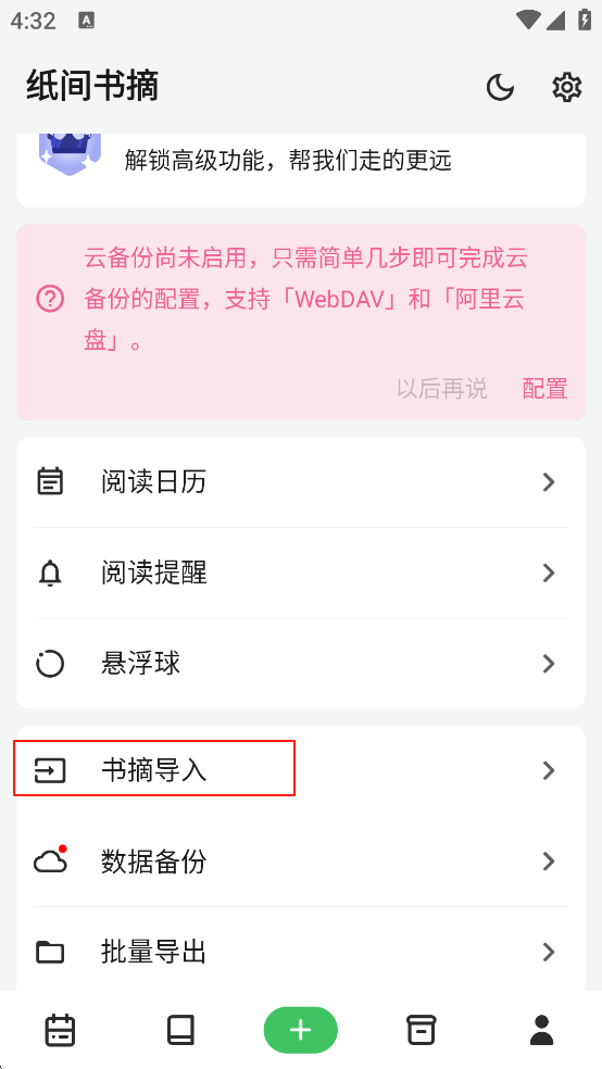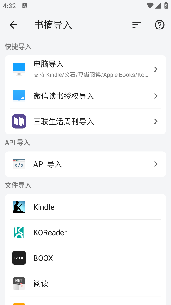 3、进入书摘导入界面,支持快捷导入、API导入和文件导入