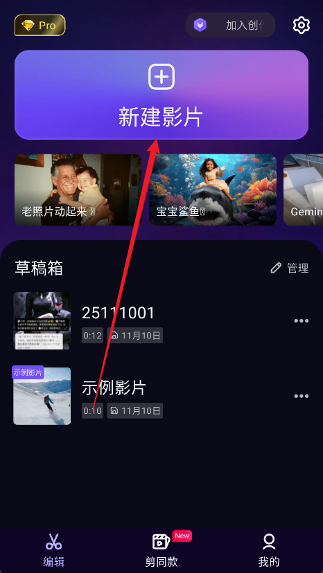 1、在软件首页位置点击新建影片。