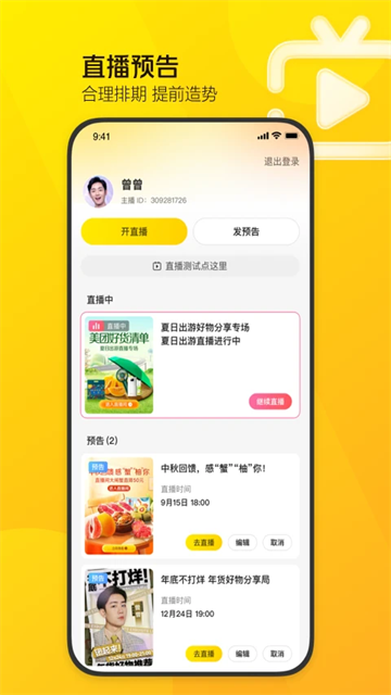 【直播预告】担心直播间没有人气?快用美团直播助手的发布直播预告功能,合理安排档期,提前转发造势,为你的直播带来更多观众!