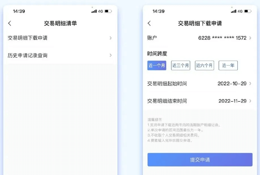 2、点击“交易明细下载申请”,选择账户、时间跨度,点击“提交申请”
