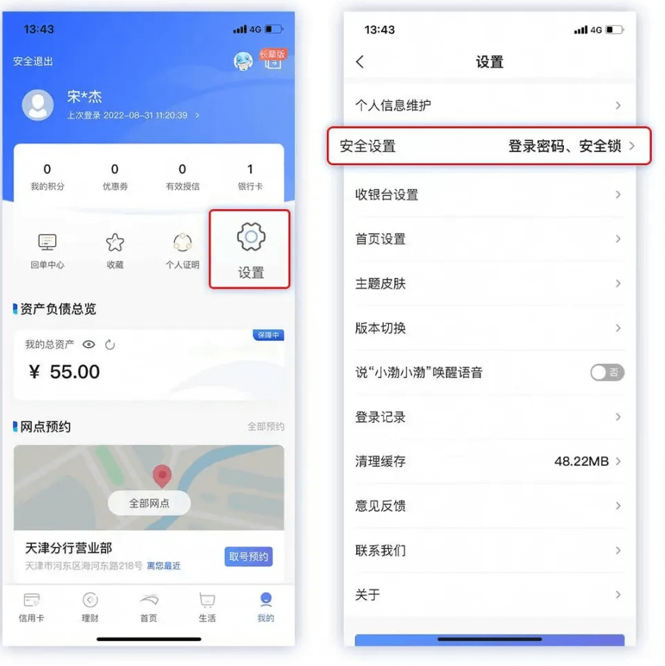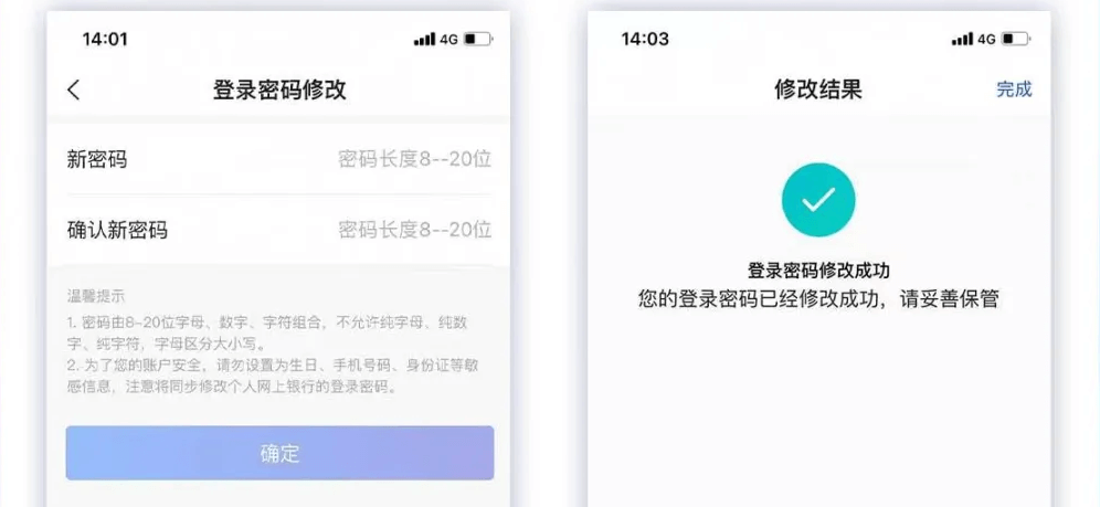 答:在登录时,选择“点击找回密码”可进入“重置登录密码页面,选择您的证件类型,输入姓名和证件号,点击“下一步”输入卡号,输入两次相同的新密码,再一次点击“提交”,进行人脸识别,识别成功即密码重置成功。