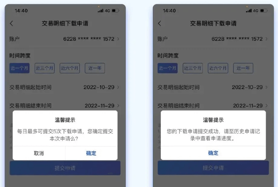 3、页面提示交易明细“每日最多可提交5次下载申请”,点击“确定”,页面提示“下载申请提交成功”