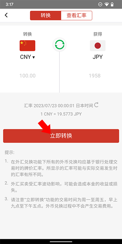 2、接着在货币兑换界面内选择想要兑换的货币后点击下方的立即转换即可