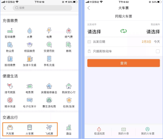 2、选择 【汽车票】【火车票】【飞机票】,即可进入车票购买页面进行在线购买。