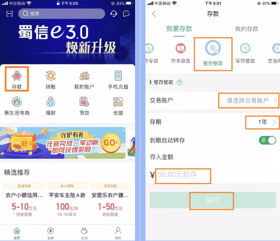 1、登录手机银行,在首页点击【存款】,选择存款种类。
