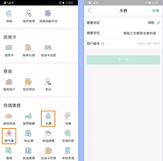 2、选择【充值缴费】—【水费】、【燃气费】。