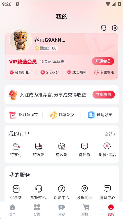 我的页面功能丰富,包括会员中心、订单管理、收货地址、客服中心、浏览记录、收藏夹等。会员用户还能查看专属折扣和福利,轻松续费或管理账户信息。