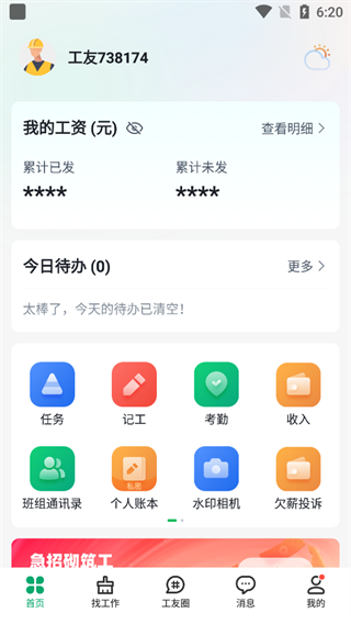 - 支持填写找活状态,不再被动等活,招工岗位智能匹配