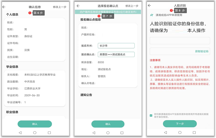 考生需按步骤完成阅读报名须知-->签订诚信承诺书-->填写名信息-->填写志愿信息-->上传相关资料(报考医卫类考生)->确认报名信息-->选择报名确认点-->填写常用手机号码->完成活体人脸比对-->报名预约成功。