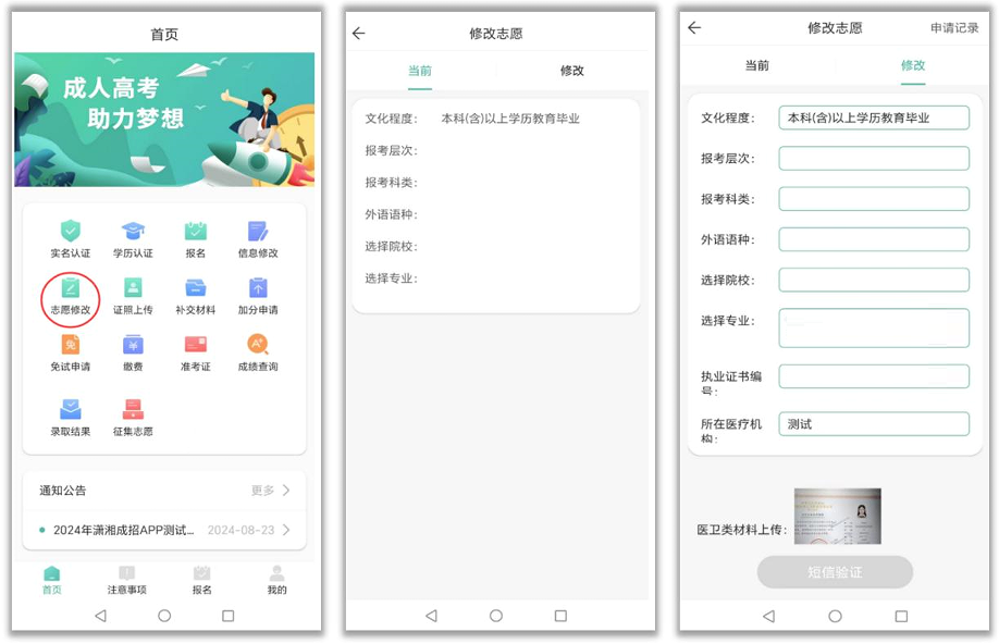 未完成报名预约的可以在报名流程中进行修改,已完成预约报名确认点的考生可以通过该志愿修改功能申请修改。申请提交后考生须持本人身份证件及相关材料原件及复印件到报名确认点现场审核,否则不予审核。