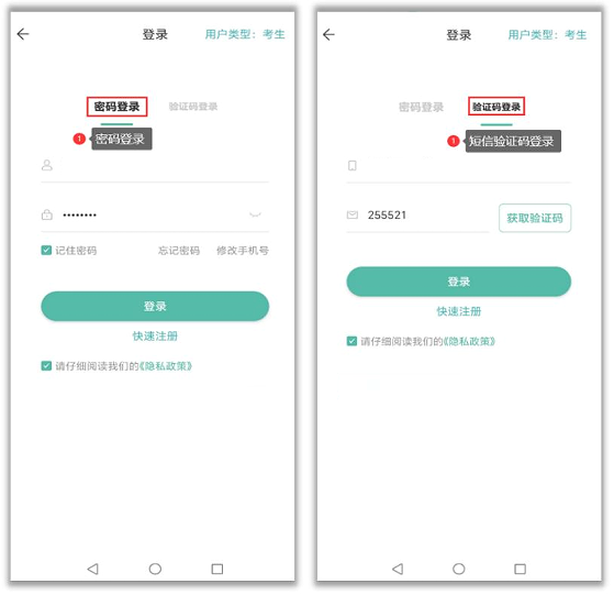 3、考生登录完成注册后便可登录 App,可以使用手机号码+登录密码、手机号码+短信验证码两种方式登录 App,推荐使用手机号+登录密码方式。