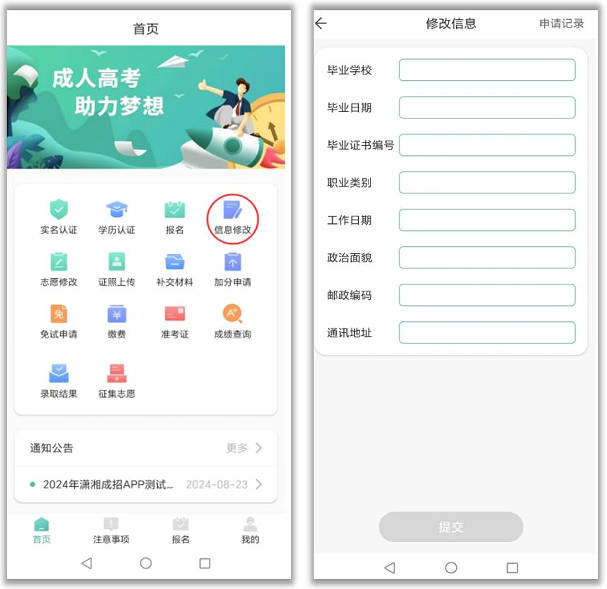 未完成报名预约的可以在报名流程中进行修改,已完成报名预约的可以通过该信息修改功能进行修改。已完成学历认证则不能修改毕业学校、毕业日期。
