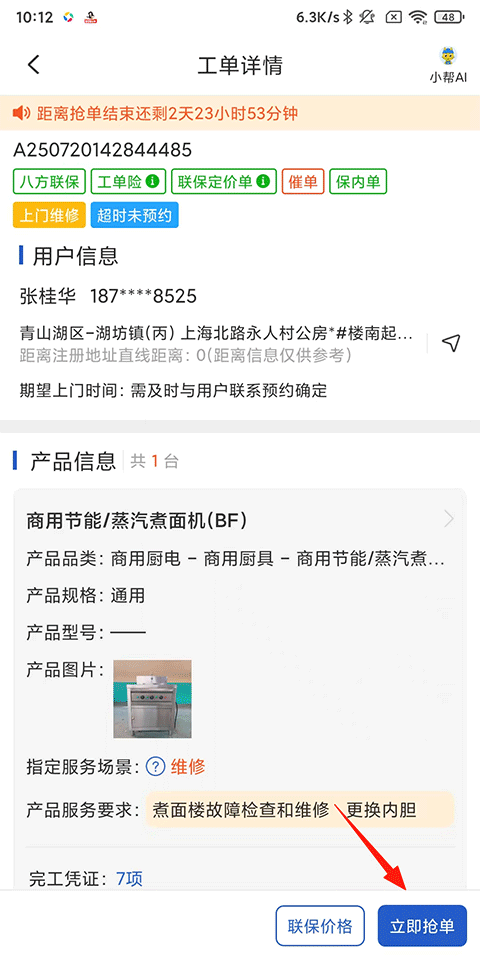 2、浏览工单详情,确认无误后点击立即抢单;