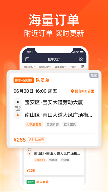 v2.1.46货拉拉搬家小哥app是货拉拉官方为搬家小哥、搬运工、运输工推出的一款规范、专业的线上接单软件,拥有400万活用户,每天海量订单接不停,每个订单都提供了详细的搬运货运要求和详情介绍,让用户们能够快速了解任务的要求。同时,货拉拉搬家小哥app还提供了一键快速体现的功能服务,用户们可以享受超快速的提现以及及时到账的工资酬劳。不仅如此,现在下载货拉拉搬家小哥app认证注册即可免费培训,培训通过之后用户无需带车通过平台就可以在线接单赚钱!