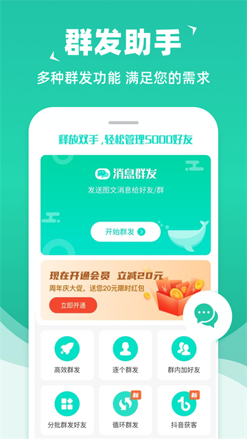 消息群发助手app是一款为用户提供全自动化微信群发服务的软件,是微商商家营销推广神器,支持多种群发内容,包括群发消息、群发图片、文字水印、图片水印等功能,更好地为你推广产品。群发消息发送的对象不仅仅是用户的好友,还可以群发至用户所在的聊天群,让消息曝光扩散的速度得到最大程度提高。消息群发助手app还加入了微商货源好货代理功能,解决微商找不到货源的困扰,致力于在稳定性能及安全性能上带给用户最完美的体验,力争成为市场上至善至美的微商工具。