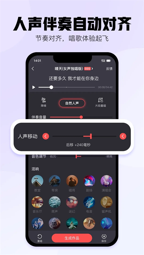 2、便捷的音效选择,用户可以根据需要调节音色与特效,确保演唱呈现最佳效果,实现个性化的音乐体验。