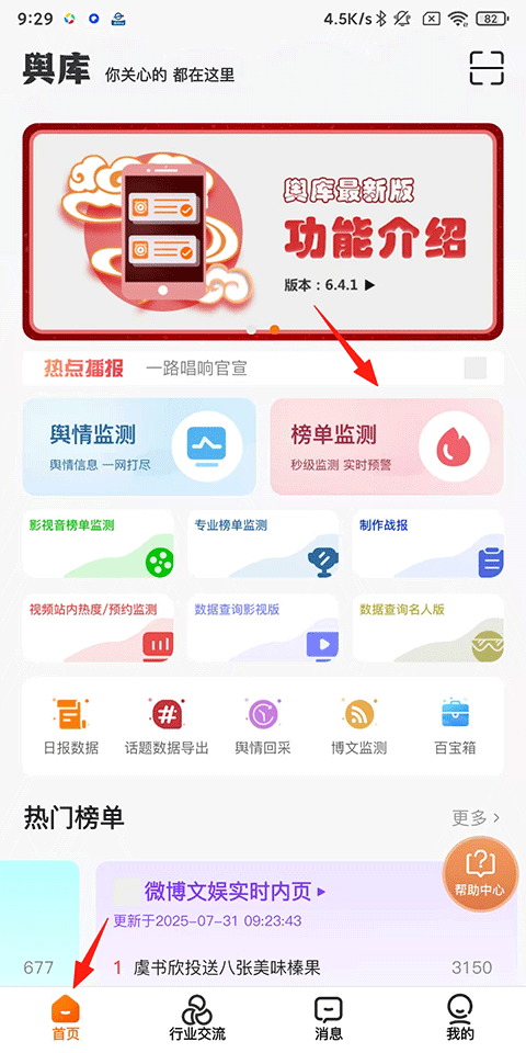 1、打开舆库APP,点击首页-榜单检测;