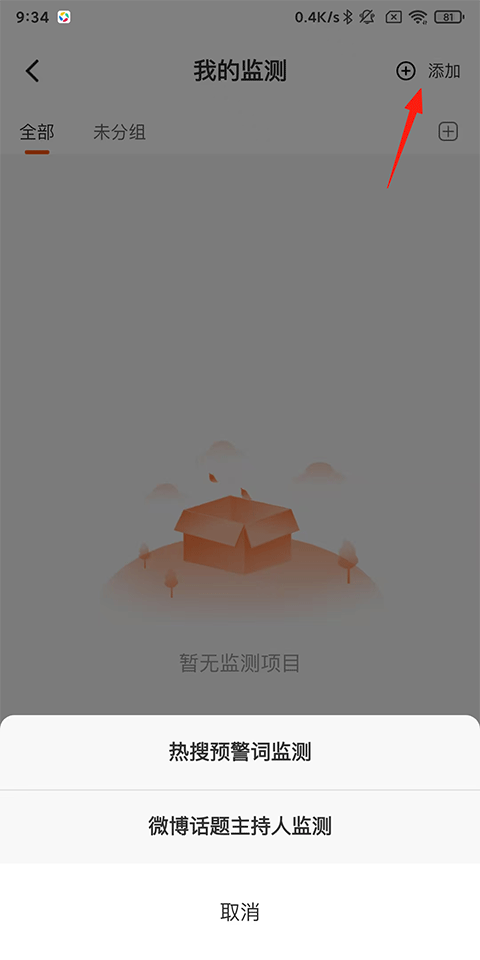 3、点击右上角添加-选择热搜预警词监测/微博话题主持人监测,以前者为例;